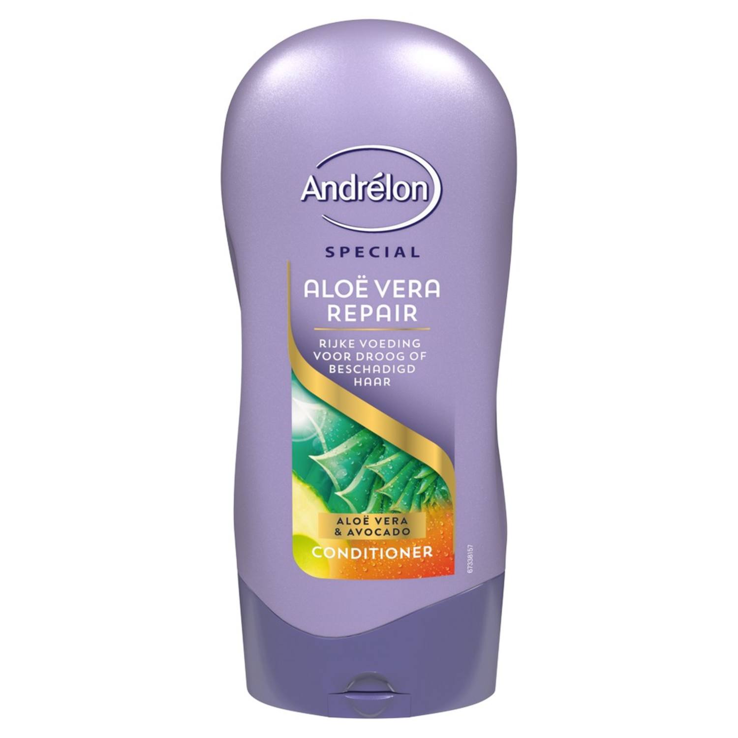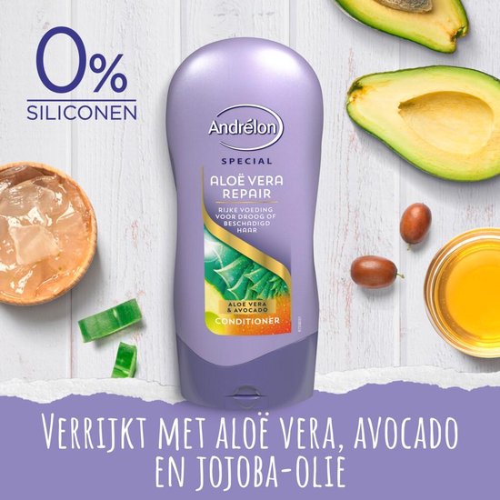 Andrélon Aloë Vera Repair Conditioner is speciaal ontwikkeld voor het herstel en de verzorging van droog of (zeer) beschadigd haar. De herstellende conditioner bevat plantaardige ontklittende bestanddelen. Deze lijn met een heerlijke frisse geur is verrijkt met aloë vera, avocado en jojoba-olie. Deze ingrediënten staan bekend om hun verzorgende, voedende eigenschappen. Je haar voelt weer sterk aan. De verbeterde lichtgewicht conditioner dringt door tot in de kern van het haar en zorgt ervoor dat het haar van binnenuit gevoed en hersteld wordt. Dit terwijl andere oliën juist op je haar blijven liggen en hierdoor verzwarend kunnen werken. Ook zorgt de conditioner ervoor dat je haar na het wassen makkelijk doorkambaar is.
