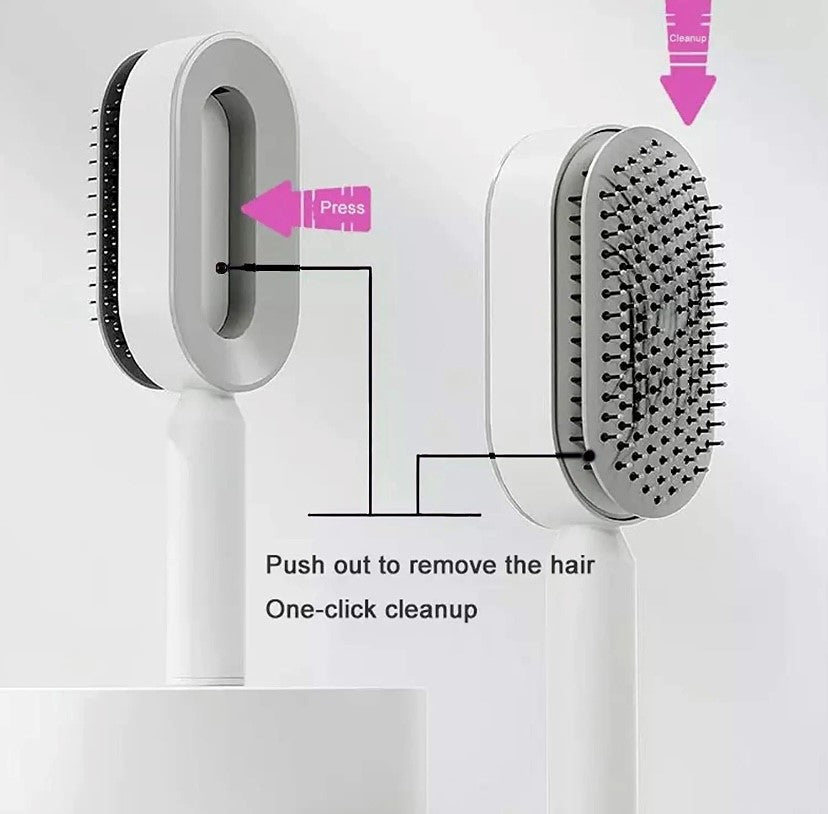 Ervaar het gemak van onze Zelfreinigende Haarbostel en geniet van een moeiteloze haarverzorgingsroutine. Zeg vaarwel tegen vervelende haren die in je borstel achterblijven en verwelkom een nieuw niveau van gemak en efficiëntie in je dagelijkse haarverzorging. Investeer in jouw haar en maak deze borstel een onmisbaar onderdeel van jouw haarverzorgingsroutine!