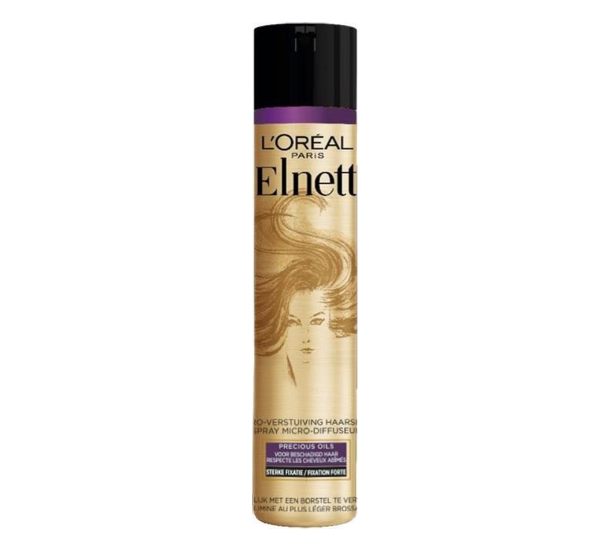 L'Oréal Paris Elnett Dry Hair Oils Haarspray 24U* sterke fixatie & bescherming tegen vochtigheid. De iconische micro-verstuiver brengt uw kapsel makkelijk in model zonder het te verzwaren.Verrijkt met arganolie, bekend om haar verzorgendeen gladmakende eigenschappen. Het haar voelt zacht en gezond aan. Houdt het haar natuurlijk in model en geeft het glans. Wordt niet stijf, plakt niet en laat geen restjes achter. Gemakkelijk met een borstel te verwijderen.